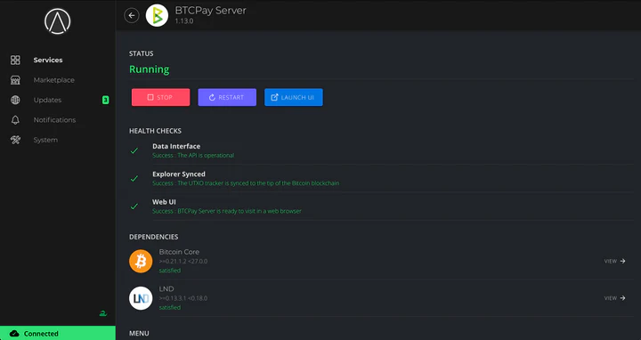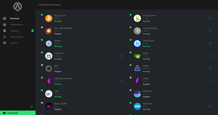 The StartOS graphical interface is served a private website, accessible from a web browser. Through it, users can discover, download, install, configure, monitor, back up, and generally manage any variety of self-hosted, open-source software.